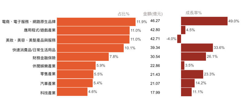 針對18個不同產業類別的投放狀況,若以總量來看,電商仍是最活躍的產業,投資金額達46.27億,佔整體廣告量的11.87%,APP遊戲類與美妝投資金額相近,分別為42.8億與42.71億,佔比為10.98%與10.96%。