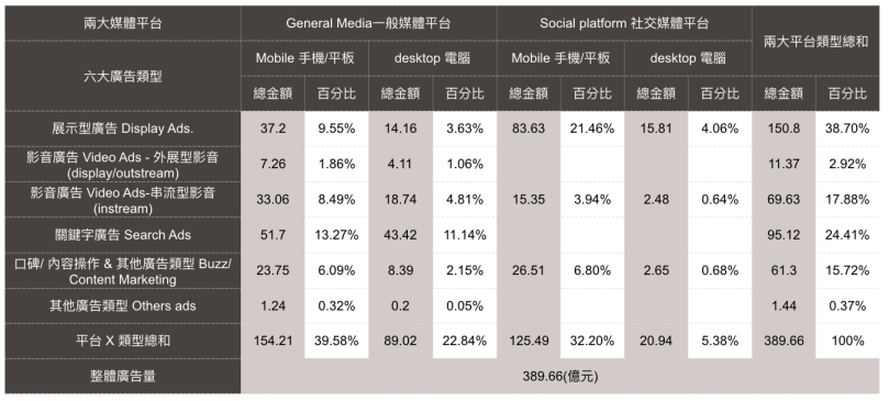 廣告量統計共分為五大類別,為展示型廣告、影音廣告、關鍵字廣告、口碑內容廣告、與其他類。從成長率來看,各類別廣告的成長幅度皆為20%左右,其中以口碑內容類型成長率稍高,達21.1%,影音廣告20.16%,關鍵字成長率為20.09%。若以總量來看,展示型廣告仍為量能最大的類別,投資額達150.8億,佔全體市場量的38.7%,關鍵字廣告居次,總額為95.11億,佔比為24.41%,影音廣告為81.10億,佔市場總量的20.79%。