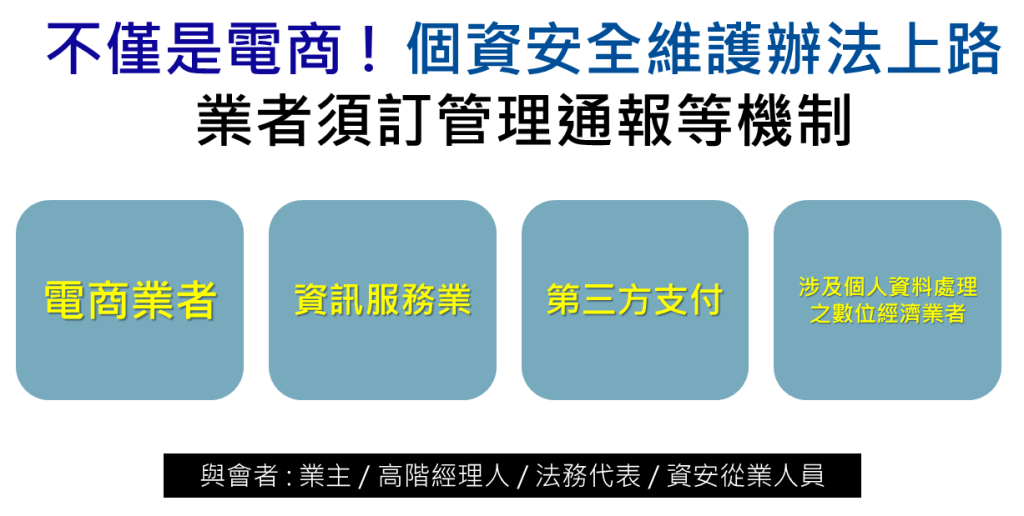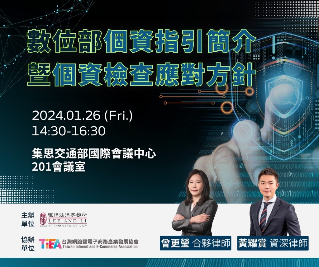 由理律法律事務所主辦,TiEA台灣網路暨電子商務產業發展協會協辦之「數位部個資指引簡介暨個資檢查應對方針」講座,將於 2024 年 1 月 26 日(五)於集思交通部國際會議中心舉行,本活動將協助企業落實安維計畫,認知應如何建立個資保護制度及資安措施,供企業參考及現場交流。